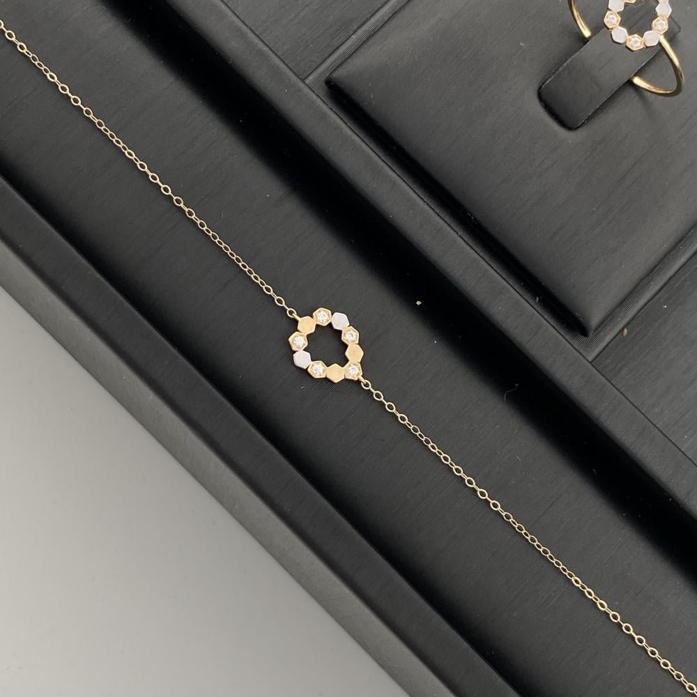- تصميم عصري: يجمع بين سلاسل مرنة وعناصر ذهبية مطفأة ومصقولة لمظهر هندسي فريد.