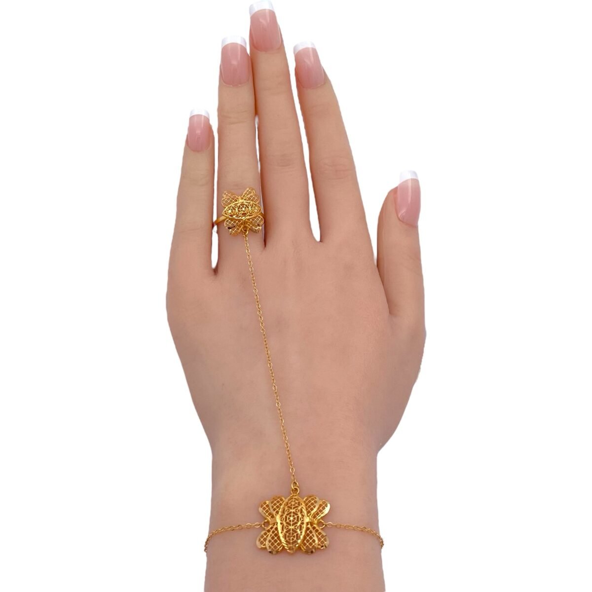 هل تبحثين عن مجوهرات أنيقة وعصرية تضفي لمسة من الفخامة على إطلالتك؟ اليكِ كف ذهب عيار 21 وزن 4.34 جرام الخيار المثالي الراقي. تجمع هذه القطعة بين الأناقة والجودة، والأنوثة.