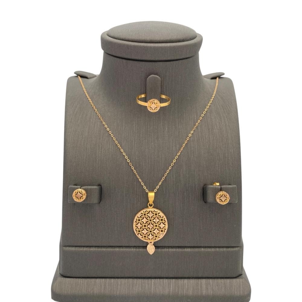 نصف طقم ذهب عيار 21 يشمل قطع فاخرة تضفي لمسة جمالية وجذابة لإطلالتك. يتميز هذا الطقم بوزنه الخفيف الذي يبلغ 3.6 جرام، مما يجعله مثالياً للاستخدام اليومي. تتضمن القطعة مجموعة أنيقة من الحلي المصممة بعناية ودقة، مما يجعلها خياراً مثالياً لمن يبحثون عن الأناقة والتميز. احصلي على هذا الطقم الراقي وأضيفي لمسة من الفخامة إلى إطلالتك اليومية.