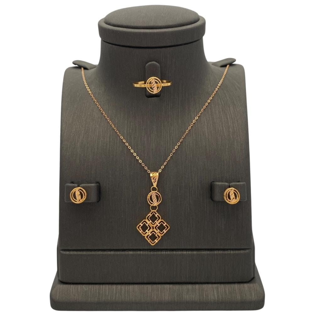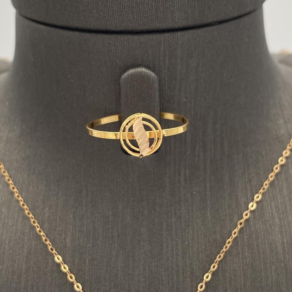 نصف طقم ذهب عيار 21 الوزن 4.46 جرام يتميز بتصميم فاخر وأنيق يضيف لمسة من الجمال والجاذبية إلى إطلالتك. يتضمن هذا الطقم قطعاً راقية ومميزة تبرز أناقتك بكل رقي وتميز. احصلي على هذا الطقم الراقي الذي سيكمل إطلالتك بأناقة وسحر، واجعليه جزءًا لا يتجزأ من مجوهراتك الثمينة.مقاس الخاتم : 8 قابل للتعديل